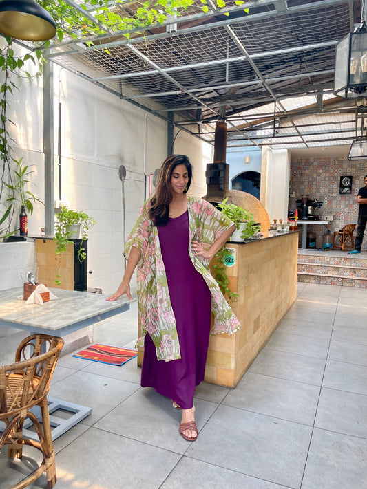Kamalam Printed Overlay with Grape Purple Cotton Slip