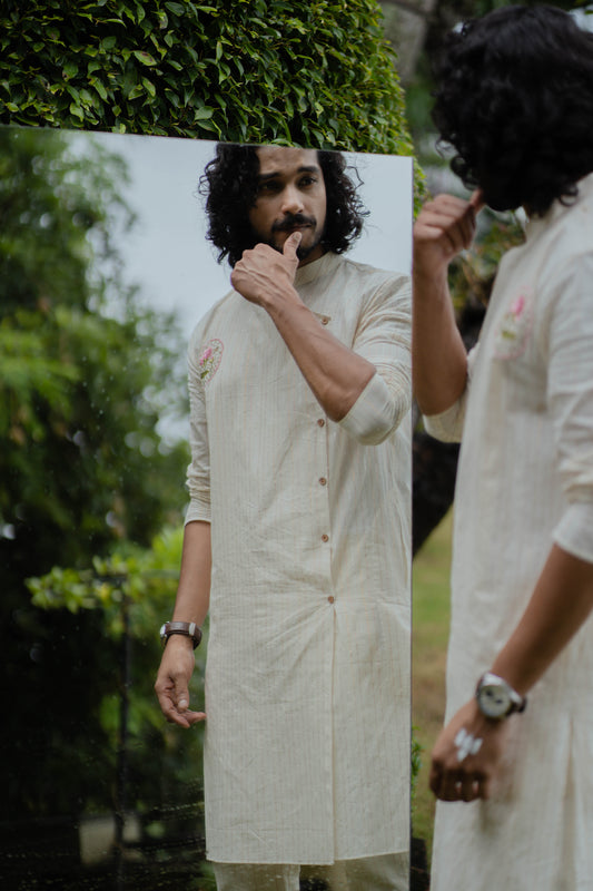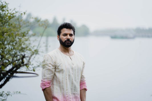 Niyaz Onam Shaded Kasavu Stripe Kurta & Pant Set