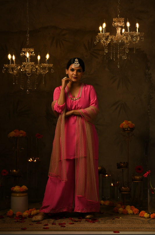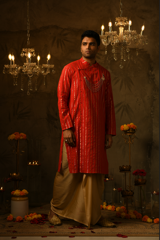 Jones Red Royal Embroidered Kurta & Silk Lungi Set