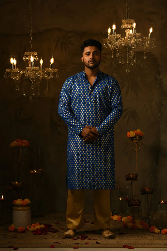 Abhijit Royal Blue Foil Print Kurta & Golden Pant Set