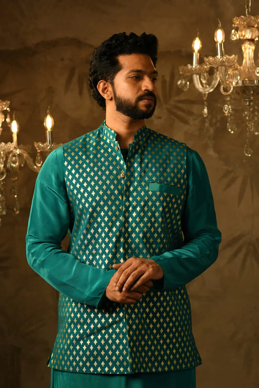 Jeku Foil Print Waist Coat with Kurta & Pant Set