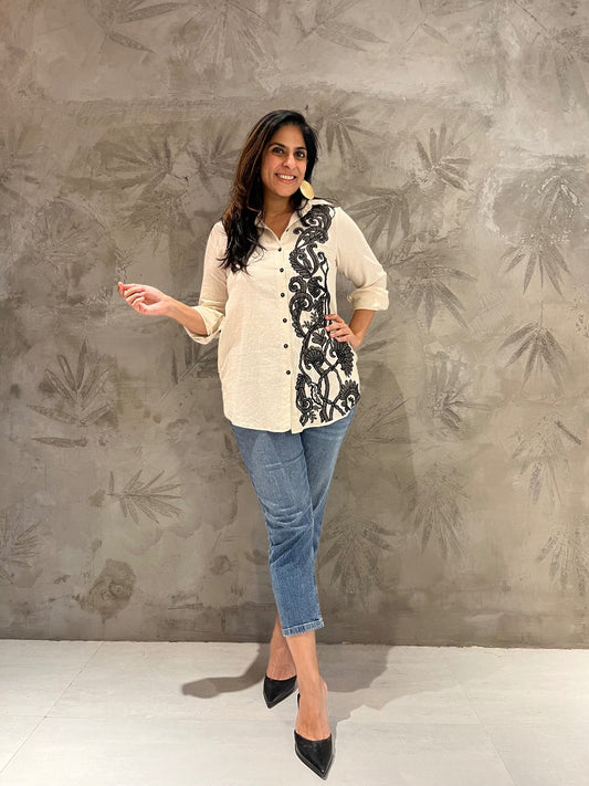 Black Floral Front Embroidered Cream Full Sleeve Shirt