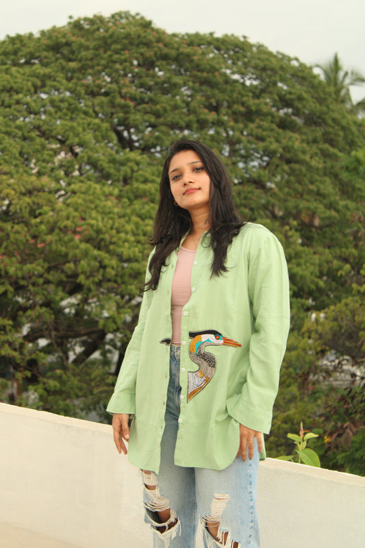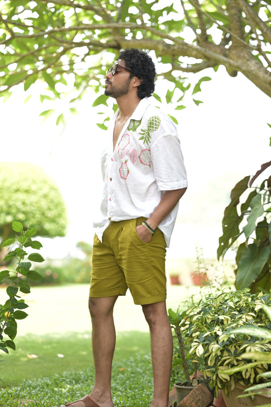 Pomogranate Placement Cuban Collar Cotton Shirt