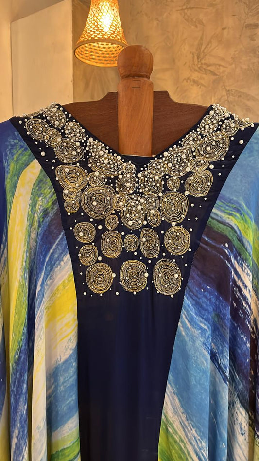 Princess Multy Coloured-Flower Embroidered Dark Blue Kaftan