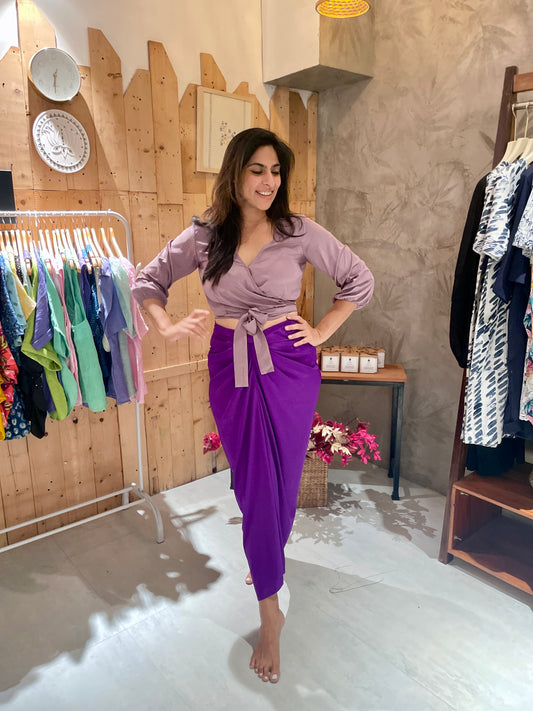 Peach Rap Tie Crop Top and Violet Drape Skirt