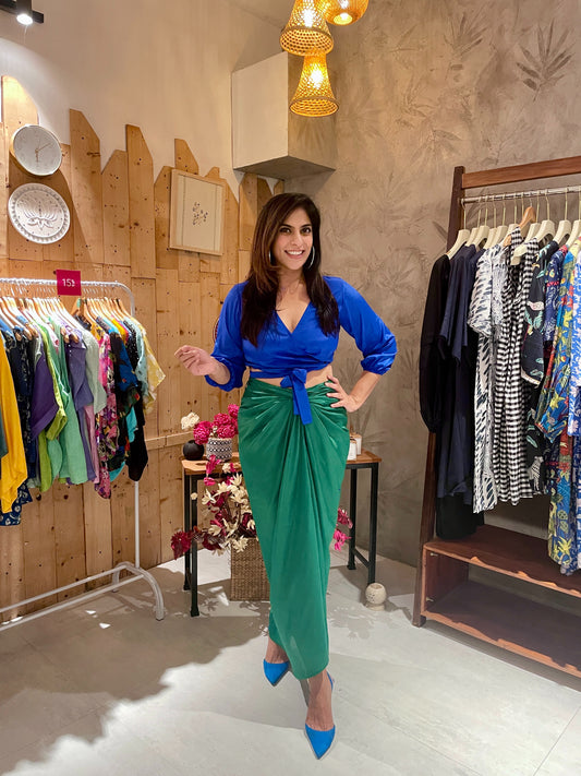 Dark Blue Rap Tie Crop Top & Green Drape Skirt