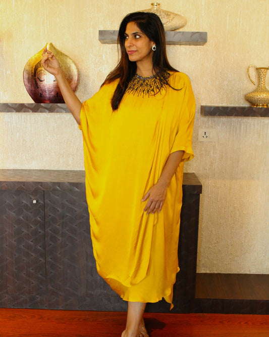 Dark Blue-Neck Embroidered Yellow Kaftan