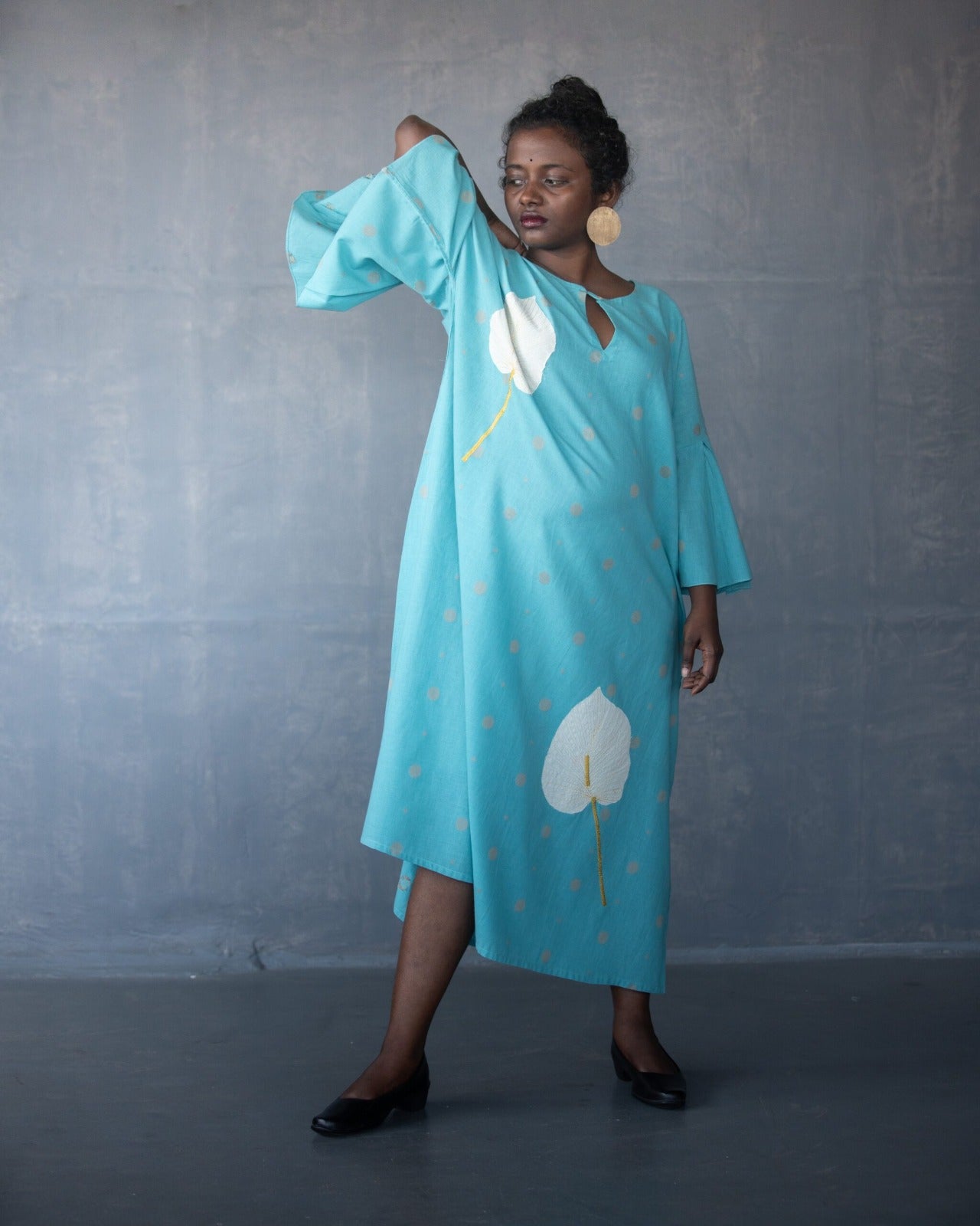 A serene blue dress adorned with delicate white leaf motif creates an effortless, timeless look. The cool blue base provides a versatile canvas, while the white detailing adds visual interest and sophistication. Perfect for casual outings or relaxed gatherings, this piece combines comfort with understated elegance. The contrasting pattern ensures you'll stand out without overwhelming your style, making it an ideal addition to any wardrobe seeking balance and grace.
