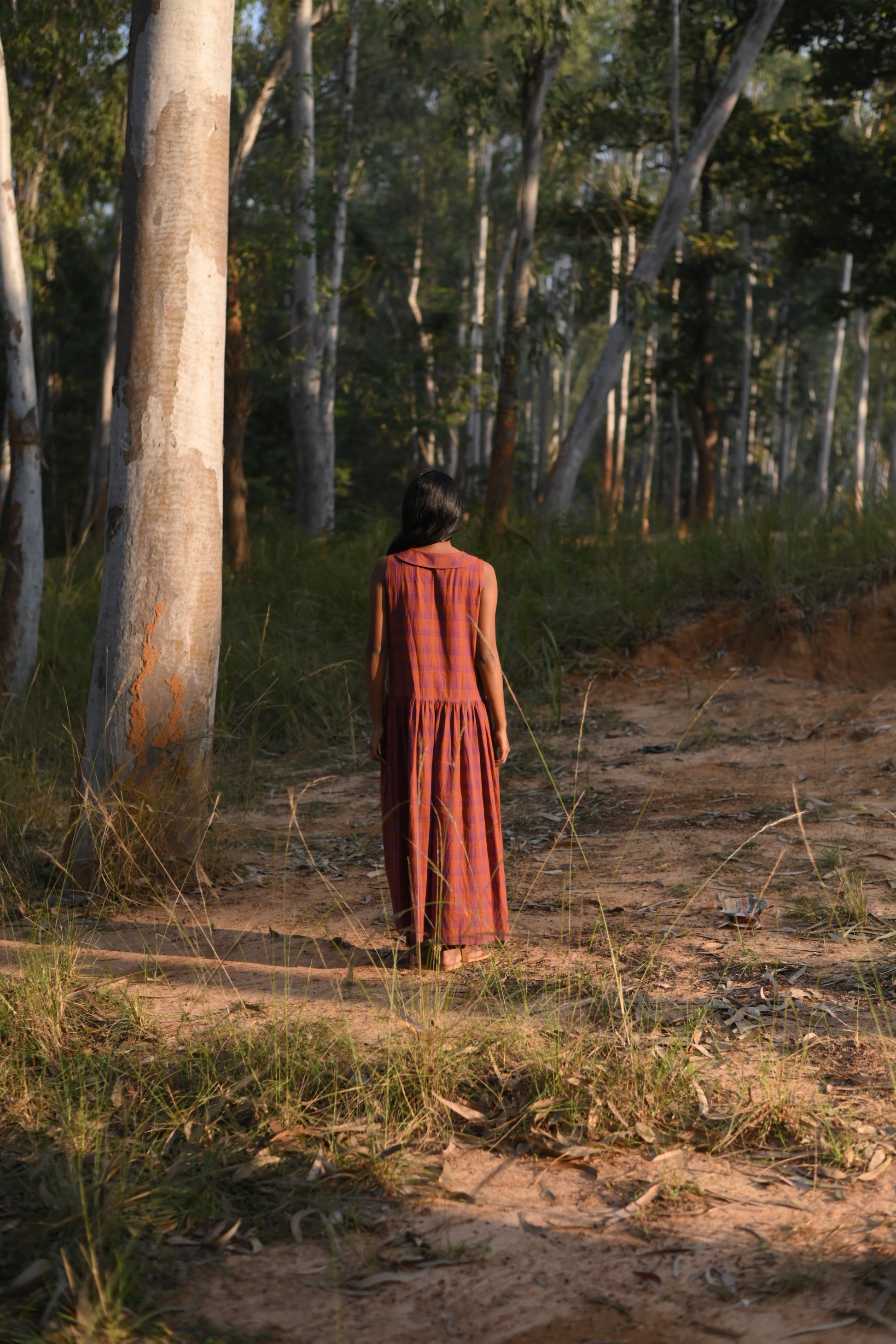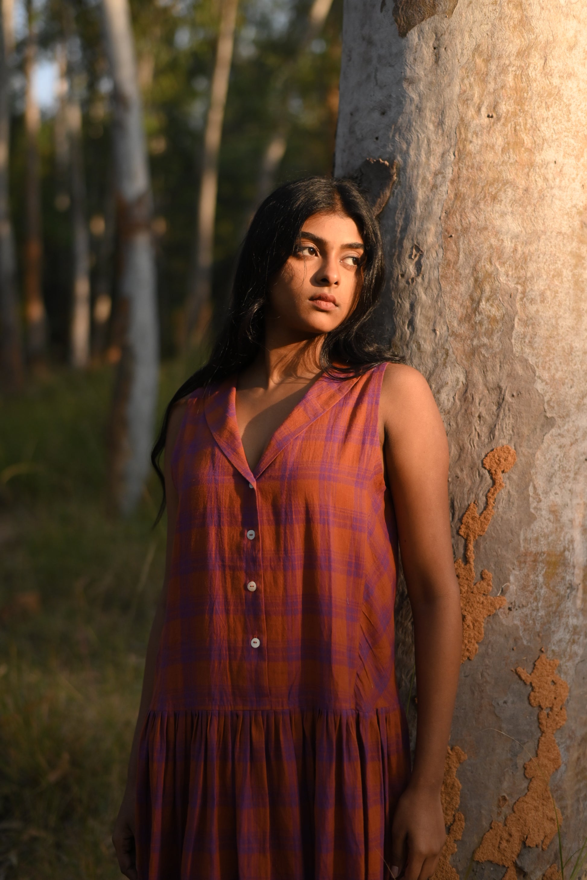 This graceful maxi dress is crafted from breathable handwoven cotton, featuring a warm rust and deep purple check pattern inspired by earthy tones. Designed with a sleeveless silhouette and a softly gathered lower panel, it offers fluid movement and effortless comfort.
