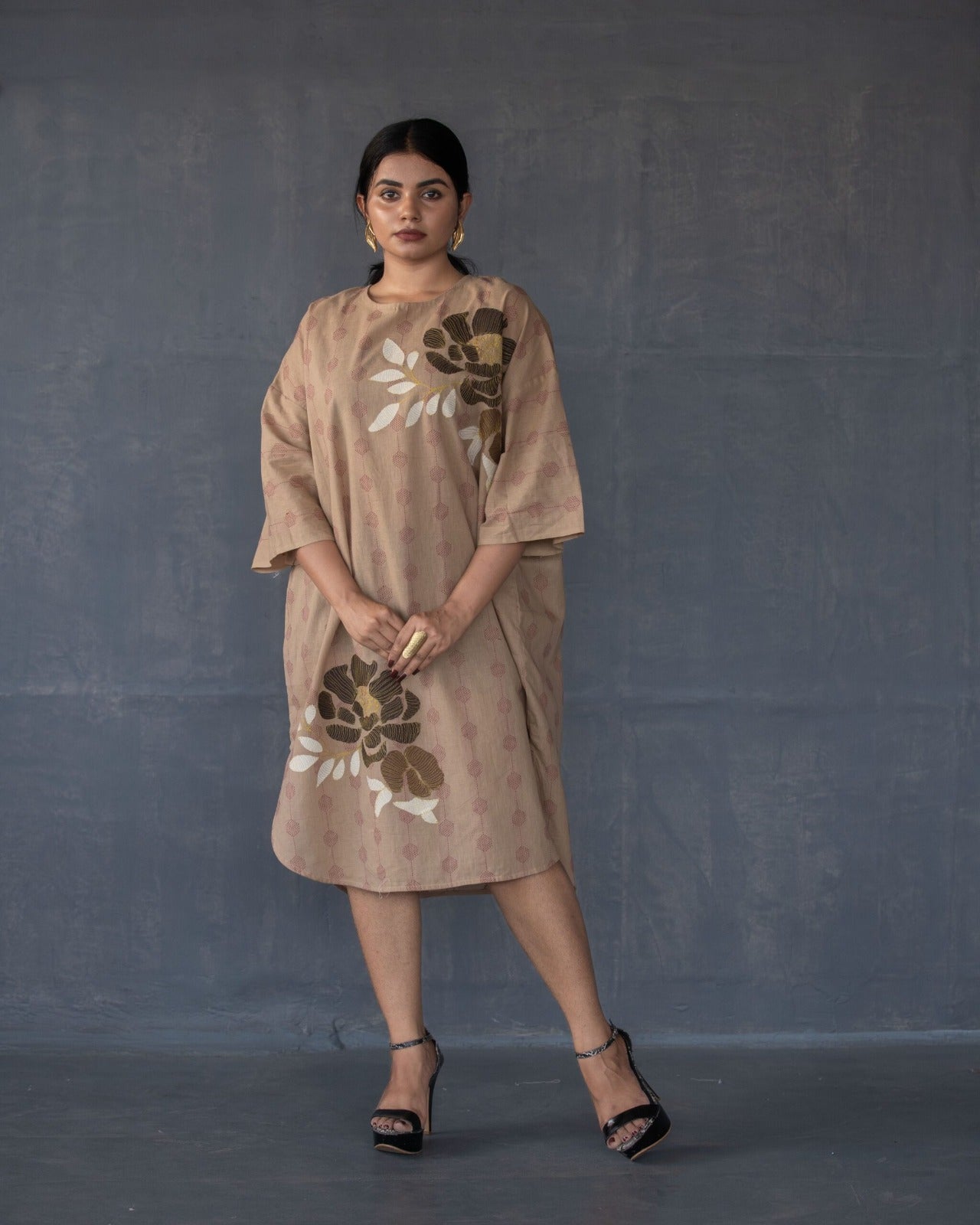 Embrace effortless elegance with this oversized brown dress, thoughtfully designed for comfort and style. Delicate flower motifs dance across the fabric, adding a touch of nature-inspired charm to your everyday wardrobe. The relaxed silhouette offers freedom of movement while maintaining a polished appearance, making it perfect for casual outings or leisurely days at home. Versatile and timeless, this piece pairs beautifully with your favorite accessories for a look that feels both grounded and graceful.