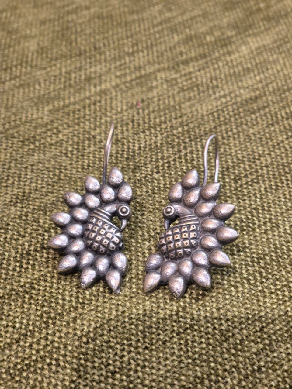 Handcrafted oxidized silver earring featuring a stunning peacock inspired tribal design. Adorned with teardrop motifs and fine antique detailing, these earrings bring out a perfect blend of boho charm and ethnic elegance, they pairs beautifully with both traditional attire and fusion outfits.