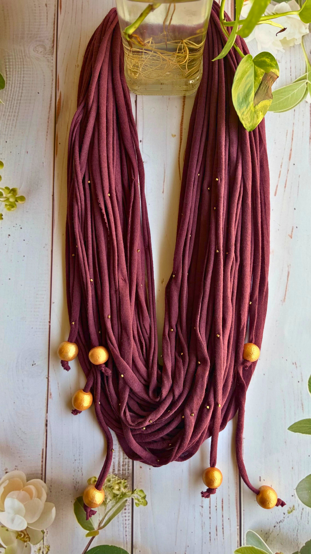 Raas Divine Wine is a handcrafted neckpiece that celebrates artisanal beauty. Draped in sumptuous wine-colored cotton, it features delicate embroidery adorned with tiny metal beads and hand-painted raw wooden beads in warm antique gold tones. Each piece is uniquely made, blending traditional craftsmanship with understated elegance. Perfect for adding a touch of refined sophistication to everyday wear or special occasions.