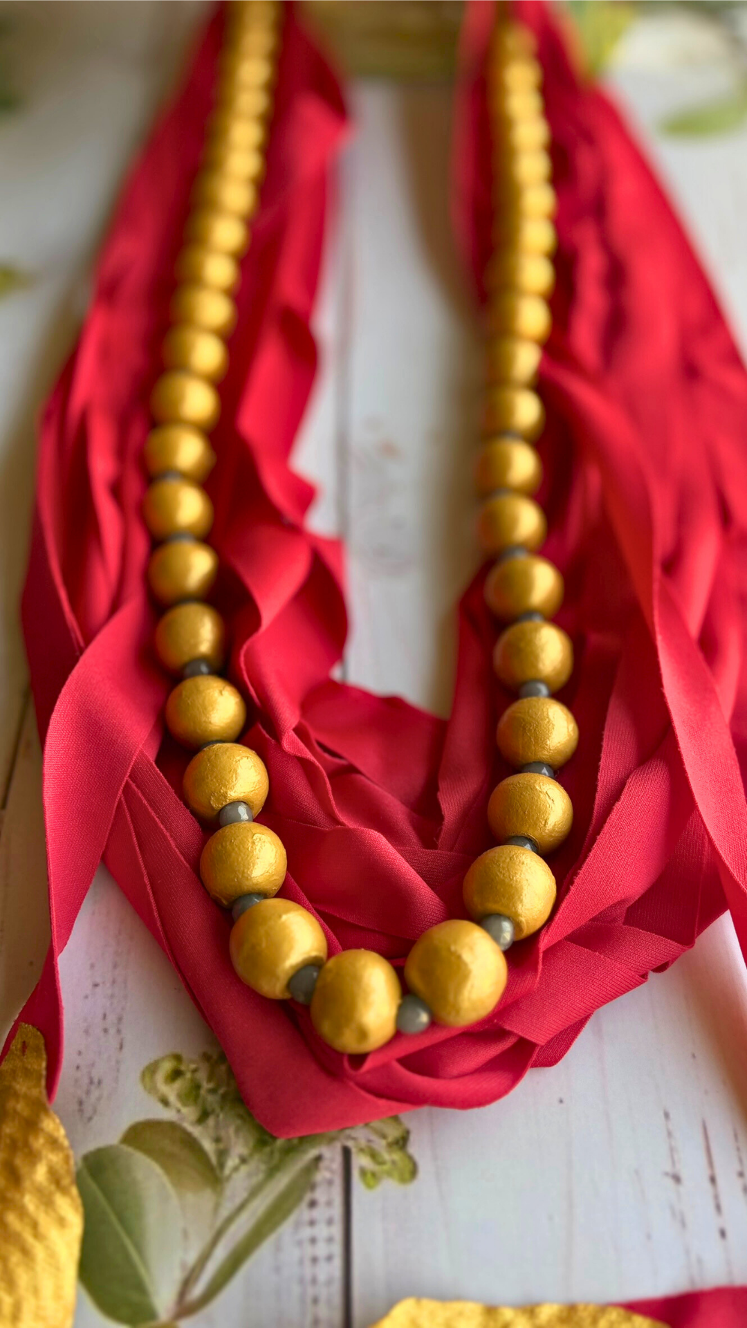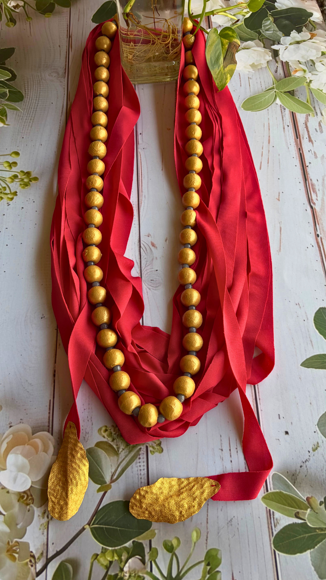 Raas Sindoor is a serene handmade neckpiece that honors traditional artistry. Woven from warm red cotton blend fabric, it brings together hand-painted wooden beads, natural semi-precious stones, and delicate vegan leather leaf tassels. The design features multiple fabric strands intricately tied together, creating an understated yet striking layered effect. Perfect for those seeking meaningful, eco-conscious jewelry that celebrates slow craftsmanship and timeless elegance.