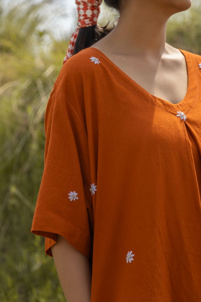 Embrace understated elegance with this rust terra midi dress, adorned with delicate all-over lazy-daisy embroidery. Each stitch creates a soft, handcrafted aesthetic that whispers rather than shouts, offering a gentle sophistication perfect for those who appreciate artisanal details. The flowing midi silhouette pairs beautifully with the intricate embroidered pattern, creating a piece that feels both timeless and thoughtfully made. Ideal for moments when you want to feel grounded and effortlessly refined.