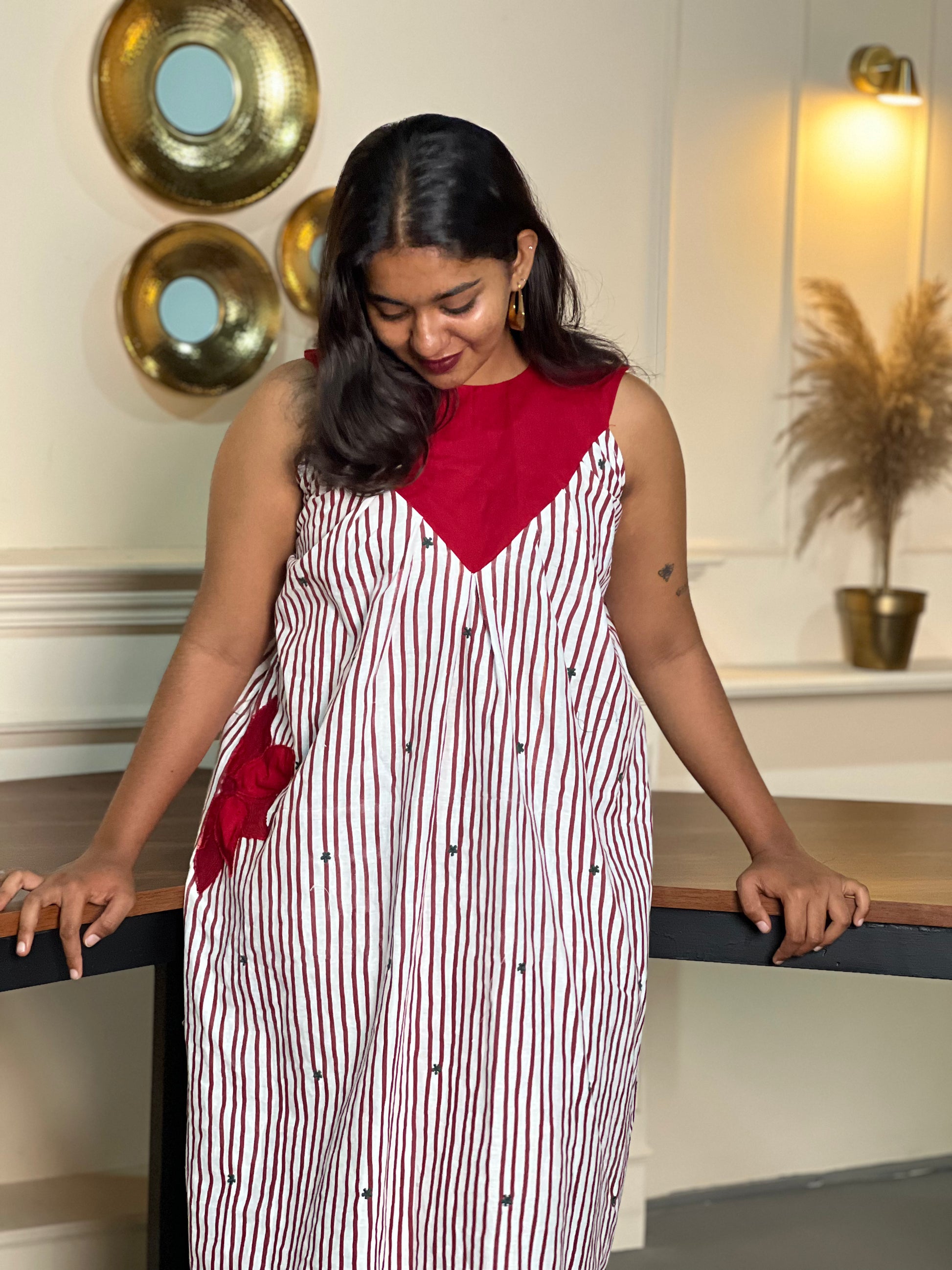 Embrace festive elegance with this striking Scarlet Pleated Dress, featuring classic white and red stripes paired with delicate green floral embroidery. Perfect for Christmas celebrations, this thoughtfully designed piece combines timeless charm with seasonal spirit. The pleated silhouette offers graceful movement and flattering drape, while the intricate embroidery adds a touch of refined detail. Ideal for holiday gatherings, family photos, or festive occasions where you want to feel both comfortable and beautifully dressed.