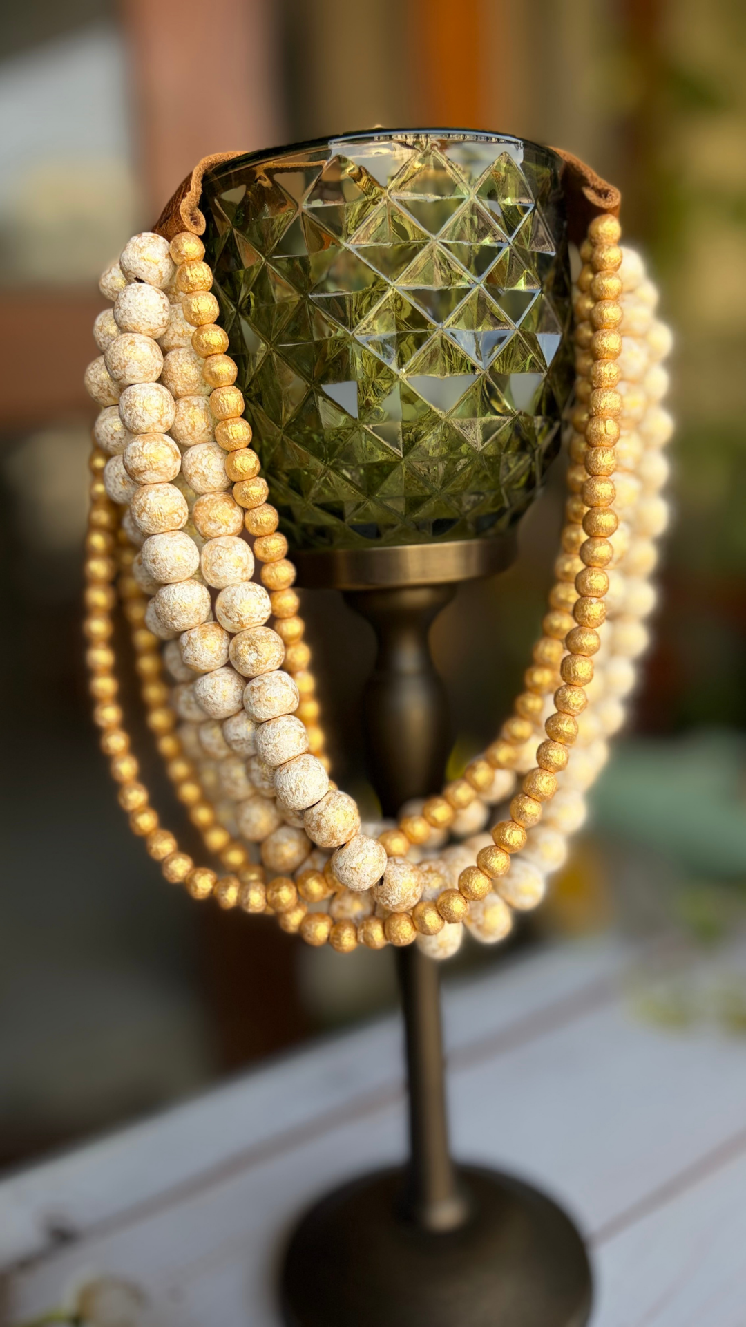 Tarangini White Woods is an elegant choker-style neck piece featuring handpainted raw wooden beads in serene white and warm gold tones. Each bead is individually crafted, creating a unique artisanal piece that celebrates natural materials and traditional techniques. The delicate design sits gracefully at the neckline, perfect for adding understated sophistication to both casual and formal wear. A timeless accessory that brings handmade charm and peaceful aesthetics to your collection.