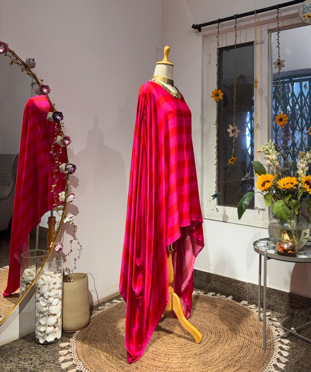 Make a graceful statement at your next gathering with this red and pink tulip stripe kaftan set. Designed for those special moments, the elegant striped pattern and rich color palette create an understated yet striking look. The relaxed silhouette flatters all body types while maintaining an air of refined sophistication. Whether it's a festive celebration, intimate dinner, or cultural event, this versatile piece transitions seamlessly from day to evening wear. Crafted for comfort without compromising on style, it's the perfect choice for effortless party elegance.